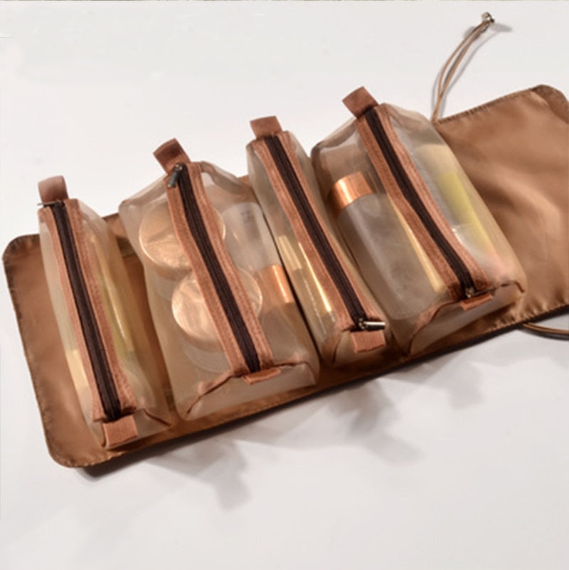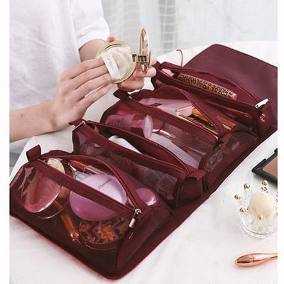 Existem 4 bolsas removíveis para armazenamento classificado de todos os seus cosméticos, produtos para a pele e produtos de higiene pessoal do dia a dia. As bolsas de tela transparente tornam todo o conteúdo claro à primeira vista, você pode encontrar facilmente o que precisa.